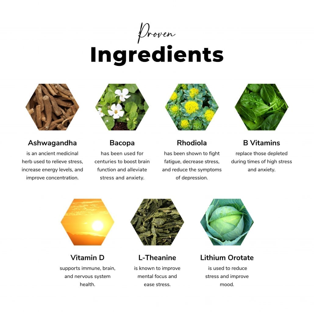 Ingredients: Ashwagandha* (Withania somnifera), Bacopa* (Bacopa monnieri), Rhodiola* (Rhodiola rosea), Eleuthero* (Eleutherococcus senticosus), Holy Basil* (Ocimum tenuiflorum), American Ginseng* (Panax quinquefolius), Schisandra Berry* (Schisandra chinensis), Vitamin B1 (Thiamine), Vitamin B12 (Methylcobalamin), Vitamin B2 (Riboflavin), Vitamin B3 (Niacin), Vitamin B5 (Pantothenic Acid), Vitamin B6 (Pyridoxal 5-Phosphate), Vitamin B9 (Methylfolate), Biotin, Inositol, Vitamin D, Zinc, Alpha GPC, L-Theanine, Lithium Orotate. *Organic