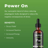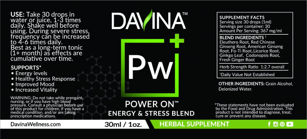 Power On is a synergistic blend of the stress-relieving adaptogenic herbs Red Chinese and American Ginseng root. This combination helps more fully utilize the stress-relieving qualities found in both herbs. Because of its ability to produce a healthier, more balanced stress response, it may reduce stress’s negative health consequences. Reduced stress may improve conditions such as digestive disorders, immune breakdown, headaches, insomnia, PMS, and anxiety, among others. Ginseng’s are also activating and can help with feeling more energized and more vitality.Â