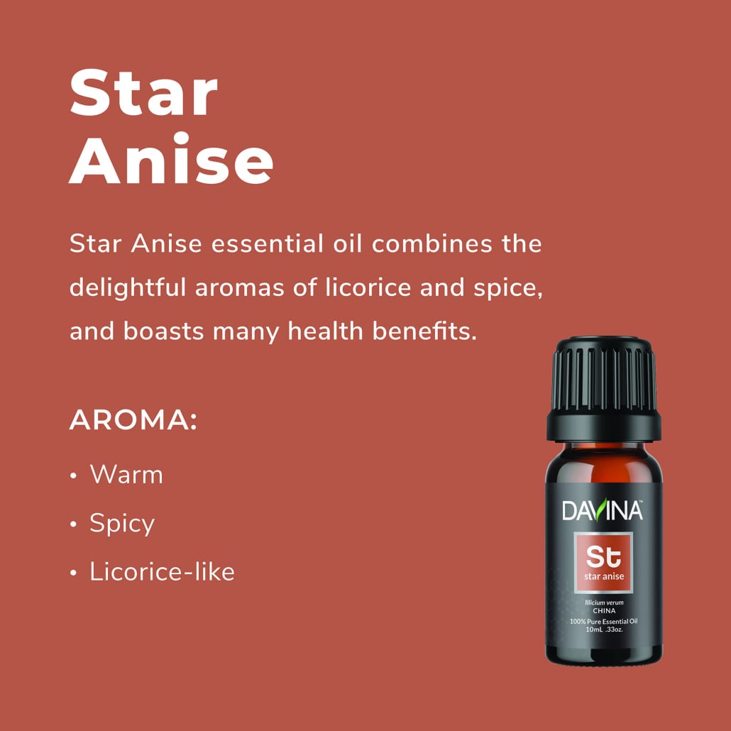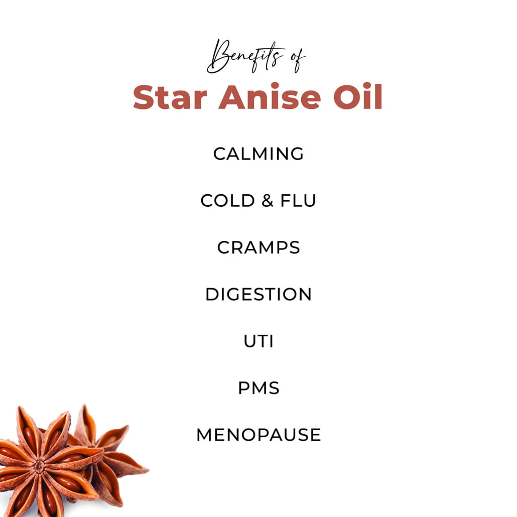 With Star Anise, you can enjoy the incredible aroma of licorice and spice. With just a drop or 2 in your diffuser, Star Anise can inspire a calm atmosphere, aid digestion, may comfort symptoms of menopause and PMS by easing cramps, relieving sore muscles and hot flashes. Because of its shikimic acid content (a main active ingredient in Tamiflu), Star Anise may have a strong antiviral capacity and can be used to aid those suffering from flu or other viral infections. Research also shows promise for use against herpes simplex, urinary tract infections, and multiple drug-resistant pathogenic bacteria.
